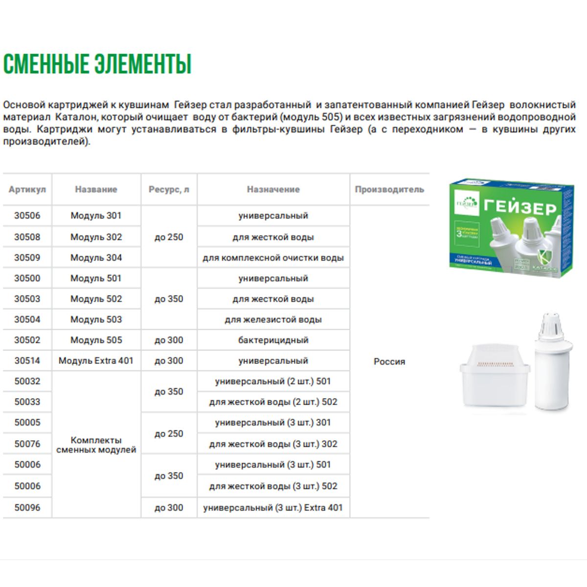 Статус: Складская программа; Страна производства: Россия; Бренд: ГЕЙЗЕР; Бренд: ГЕЙЗЕР; Артикул: 30508; Код: УТ000004729; Тип установки: В кувшин; Тип воды: Жёсткая; Очищает от: Железо,тяжелые металлы,органические и хлорорганические соединения,бактерии и вирусы; Количество картриджей: 1; Пористость картриджа: 0,2-0,5; Производительность фильтра, л/мин: 0,2; Гарантия на товар: 1 год; Высота, мм: 140; Ширина, мм: 60; Упаковка: Картон; Объем, куб.м: 0.001; Вес, кг: 0,15; Страна бренда: Россия; Срок поставки: 1-3 дня