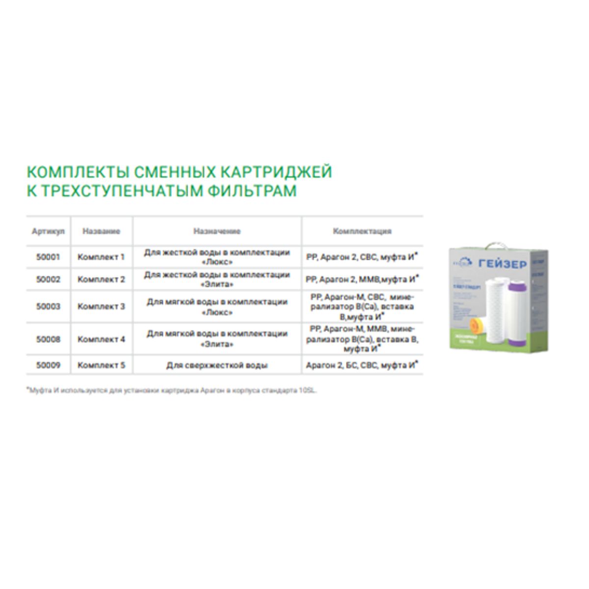 Статус: Складская программа; Страна производства: Россия; Бренд: ГЕЙЗЕР; Бренд: ГЕЙЗЕР; Артикул: 50001; Код: УТ000002013; Тип установки: В колбу; Тип воды: Жёсткая; Очищает от: Взвешанных частиц,мутности,цветности,хлора,тяжелых металлов,органических соединений,солей жесткости и др. примесей; Количество картриджей: 3; Пористость картриджа: 01-10; Производительность фильтра, л/мин: 3; Гарантия на товар: 1 год; Высота, мм: 270; Ширина, мм: 220; Упаковка: Картон; Объем, куб.м: 0.006; Вес, кг: 1,36; Страна бренда: Россия; Срок поставки: 1-3 дня