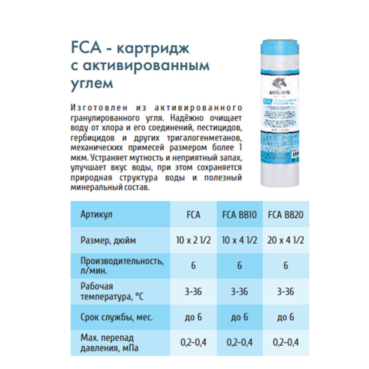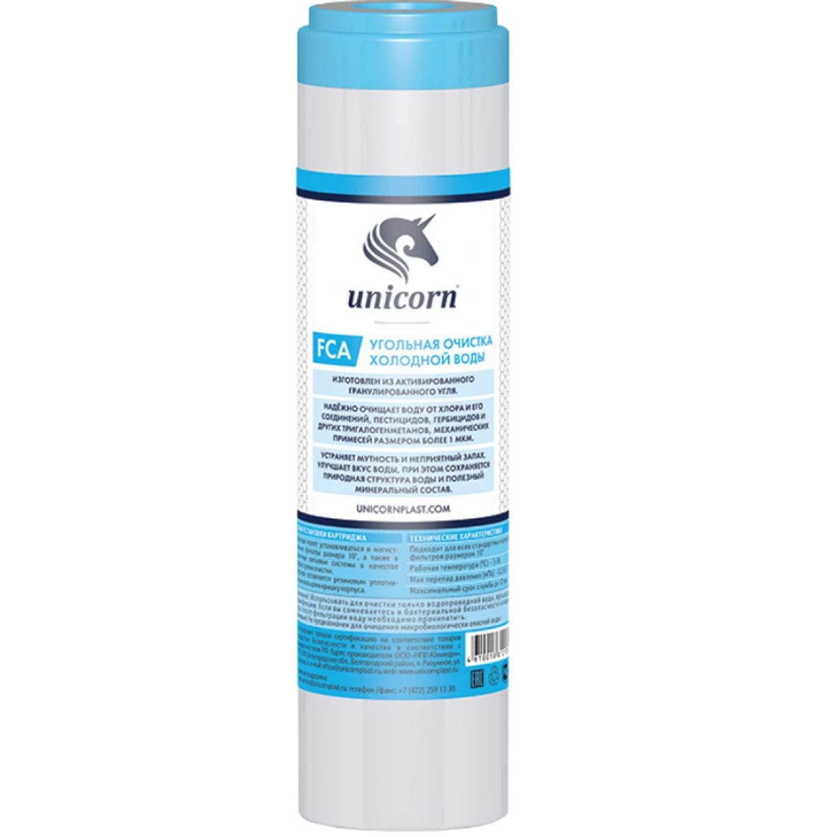 Статус: Складская программа; Страна производства: Россия; Бренд: UNICORN; Бренд: UNICORN; Артикул: FCA 10"; Код: УТ000003337; Тип установки: В колбу; Тип воды: Жёсткая; Очищает от: Хлора и его соединений,пестицидов,гербицидов и других тригалогенметанов,механических примесей. Улучшает вкус,запах,и цвет воды; Количество картриджей: 1; Пористость картриджа: 1; Производительность фильтра, л/мин: 6; Гарантия на товар: 1 год; Высота, мм: 254; Ширина, мм: 64; Упаковка: Пакет; Объем, куб.м: 0.001; Вес, кг: 0,4; Страна бренда: Россия; Срок поставки: 1-3 дня