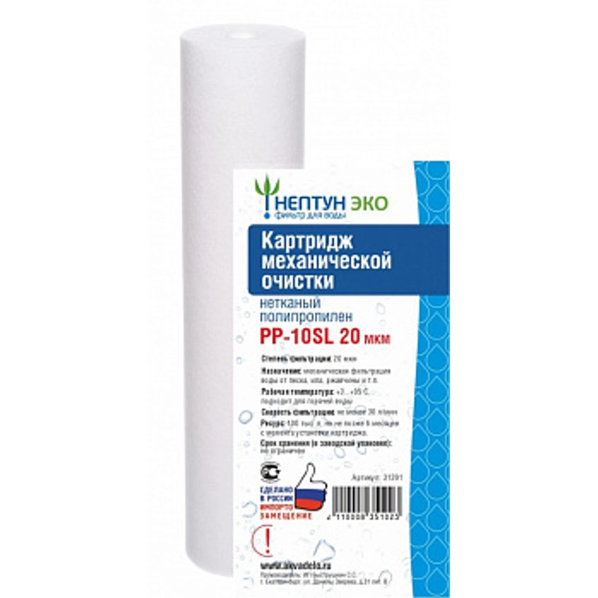 Статус: Распродажа; Страна производства: Россия; Бренд: Нептун; Артикул: 31391; Код: УТ000037458; Тип установки: В колбу; Тип воды: Для всех типов воды; Очищает от: Песка, ила, ржавчины и т.п.; Количество картриджей: 1; Пористость картриджа: 20; Производительность фильтра, л/мин: 30; Гарантия на товар: 1 год; Высота, мм: 254; Страна бренда: Россия; Срок поставки: 1-3 дня