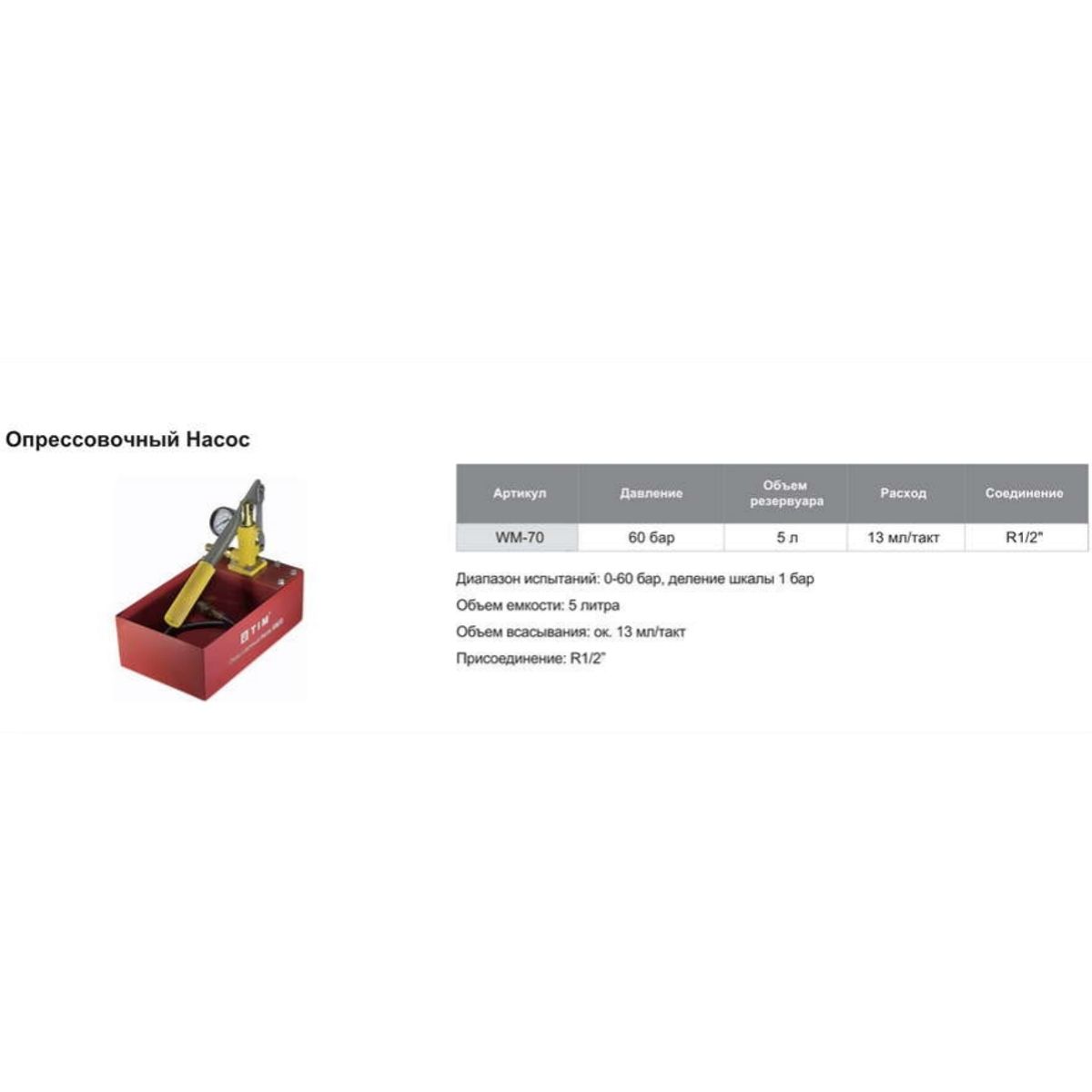Статус: Складская программа; Страна производства: Китай; Бренд: TIM; Бренд: TIM; Артикул: WM-70A; Код: УТ000022388; Назначение: Для опрессовки; Тип: Ручной; Материал корпуса: Металл; Испытательное давление, бар: 60; Объем бака, л: 5; Соединение к трубопроводу: 1/2"; Мах температура жидкости, °С-: 40; Гарантия на товар: 1 год; Высота, мм: 320; Ширина, мм: 270; Глубина, мм: 210; Упаковка: Картон; Объем, куб.м: 0,0166; Вес, кг: 3,09; Страна бренда: Китай; Срок поставки: 1-3 дня