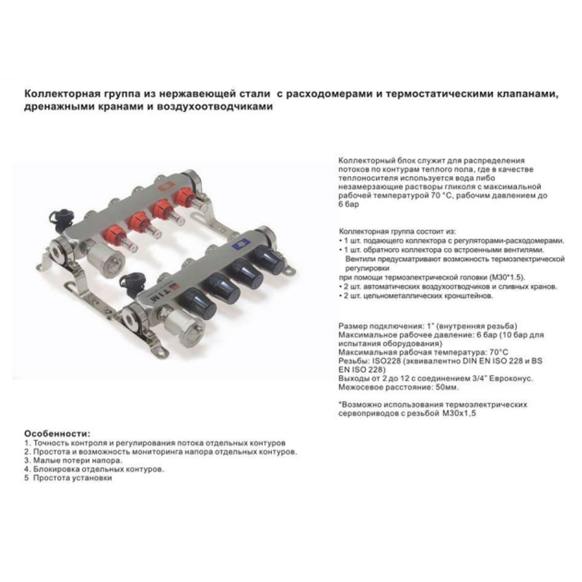 Статус: Складская программа; Страна производства: Китай; Бренд: TIM; Бренд: TIM; Артикул: KDS5003; Код: УТ000019348; Назначение: Для тёплого пола; Материал: Нержавеющая сталь; Количество выходов (отводов): 3; Расходомеры в комплекте: Да; Кран шаровый в комплекте: Нет; Воздухоотводчики в комплекте: Нет; Вентиля в комплекте: Нет; Манометр в комплекте: Нет; Сливной кран в комплекте: Нет; Тип встроенного клапана: Термостатический; Тип присоединения коллектора: Внутренняя резьба; Тип присоединения выхода: Наружная резьба; Тип соединения выхода (отвода): Резьба; Присоединительный размер коллектора (отвода): 1"; Межосевое расстояние между выходами (отводами), мм: 50; Уплотнение отвода: Под евроконус; Давление максимальное, бар: 6; Гарантия на товар: 2 года; Высота, мм: 171-225; Упаковка: Картон; Объем, куб.м: 0,095; Вес, кг: 2,278; Страна бренда: Китай; Срок поставки: 1-3 дня