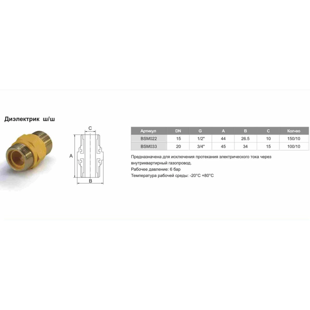 Статус: Под заказ; Страна производства: Китай; Бренд: TIM; Бренд: TIM; Коллекции: Диэлектрик для газовых приборов; Артикул: BSM033; Код: УТ000024684; Вид фитинга: Вставка; Материал: Латунь/полиамид стеклонаполненный; Тип монтажа (соединения): Резьбовое соединение; Тип присоединения (внут-нар резьба): Наружная; Диаметр присоединения, мм: 20; Диаметр резьбы, дюйм: 3/4"; Максимальное Рабочее давление, бар: 6; Гарантия на товар: 1 год; Объем, куб.м: 0,0001; Вес, кг: 0,69; Страна бренда: Китай; Срок поставки: 1-3 дня