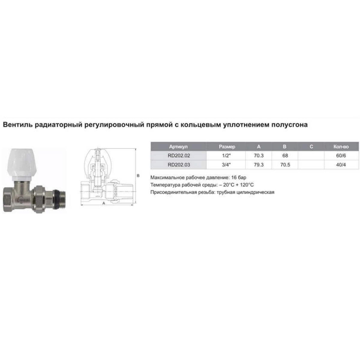 Статус: Складская программа; Страна производства: Китай; Бренд: TIM; Бренд: TIM; Артикул: RD202.02; Код: УТ000019597; Тип системы отопления: Однотрубная и двухтрубная система; Материал: Латунь; Покрытие-: Никелированное; Вид подключения: Прямой; Тип подключения к отопительному прибору: Боковое подключение; Вид резьбы (внутр- наруж): Внутренняя резьба/накидная гайка; Диаметр подключения резьбовой: 15; Рабочее давление, бар: 16; Запорное устройство: Шток; Максимальная рабочая температура, С-: 110; Длина вентеля, мм-: 70,3; Высота, мм: 68; Глубина, мм: 30; Гарантия на товар: 1 год; Упаковка: Пакет; Вес, кг: 0,205; Объем, куб.м: 0,0003; Страна бренда: Китай; Срок поставки: 1-3 дня