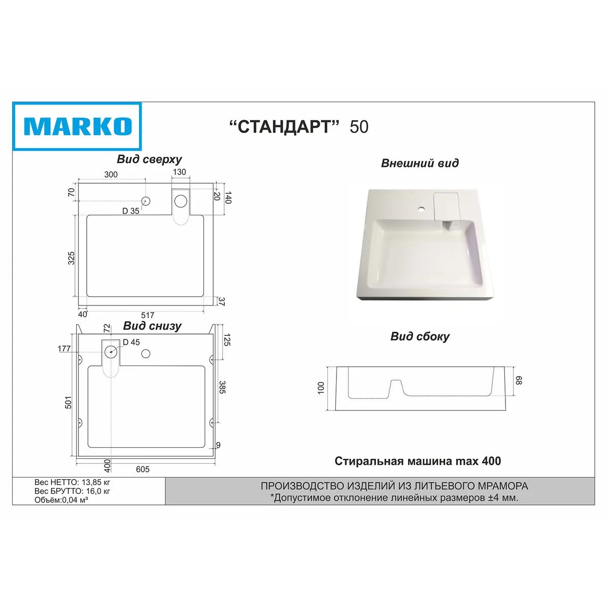 Статус: Складская программа; Страна производства: Россия; Бренд: MARKO; Бренд: MARKO; Назначение: Над стиральной машиной; Коллекции: Стандарт; Артикул: 5227500; Код: УТ000025543; Материал: Литьевой мрамор; Стиль дизайна: Классический; Линии форм: Прямоугольные; Цвет: Белый; Эффект покрытия: Глянцевый; Высота раковины, мм: 100; Глубина раковины, мм: 501; Ширина раковины, мм: 605; Отверстие под смеситель: Да; Гарантия на товар: 3 года; Объем, куб.м: 0.055; Вес, кг: 19; Страна бренда: Россия; Срок поставки: 1-3 дня