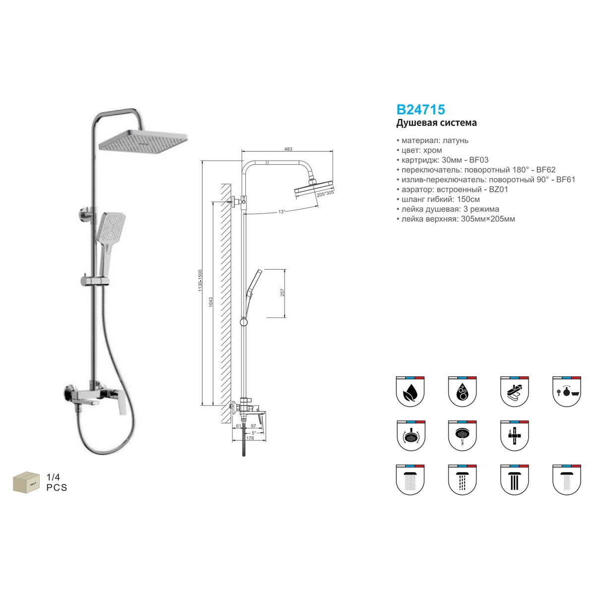 Статус: Складская программа; Страна бренда: Китай; Страна производства: Китай; Бренд: BELZ; Бренд: BELZ; Коллекции: B715; Назначение: Душевые системы; Артикул: B24715; Код: УТ000036597; Тип управления: Рычажный; Материал корпуса: Латунь; Стиль дизайна: Современный; Линии форм: Прямоугольные; Цвет покрытия: Хром; Эффект покрытия: Глянцевый; Длина излива, мм: 130; Поворотный излив: Да; Тропические душевые стойки со смесителем: Да; Гибкий излив: Нет; Гарантия на товар: 5 лет; Срок поставки: 1-3 дня