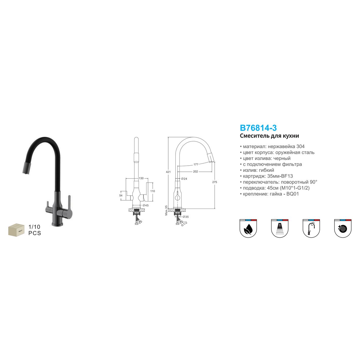 Статус: Складская программа; Страна бренда: Китай; Страна производства: Китай; Бренд: BELZ; Бренд: BELZ; Коллекции: B814; Назначение: Для кухни; Артикул: B76814-3; Код: УТ000036642; Тип управления: Рычажный; Материал корпуса: Латунь; Стиль дизайна: Современный; Линии форм: Округлые; Цвет покрытия: Графит; Эффект покрытия: Матовый; Длина излива, мм: 200; Поворотный излив: Да; Подключение к фильтру: Да; Гибкий излив: Нет; Гарантия на товар: 5 лет; Срок поставки: 1-3 дня